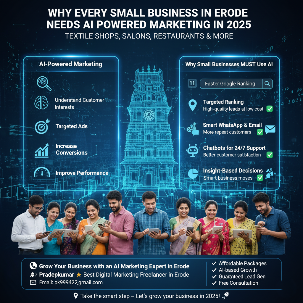 Digital marketing is rapidly evolving, and in 2025, the biggest driver of change is Artificial Intelligence (AI). For small businesses in Erode—whether you’re a textile shop in Surampatti, a restaurant in Thirunagar, or a startup in Perundurai—AI is no longer a futuristic idea. It is already reshaping how brands attract customers, manage ads, and stay competitive.